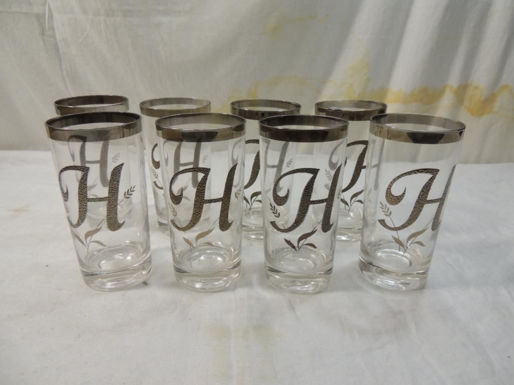 VINTAGE THORPE STYLE SILVER RIM GLASSES MONOGRAMMED " H " GLASSES. VINTAGE GLASSWARE, DECORATIVE GLASSWARE AS SHOWN SEE PHOTO FOR MORE DETAILS.
