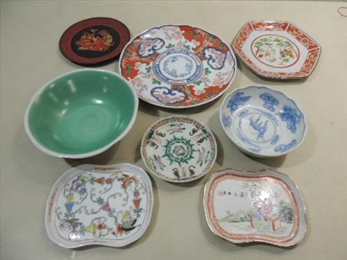 LOT 8 VINTAGE ORIENTAL DECOREATED CHINA PLATES & BOWLS. AS SHOWN. VIEW PICTURE FOR DETAIL.