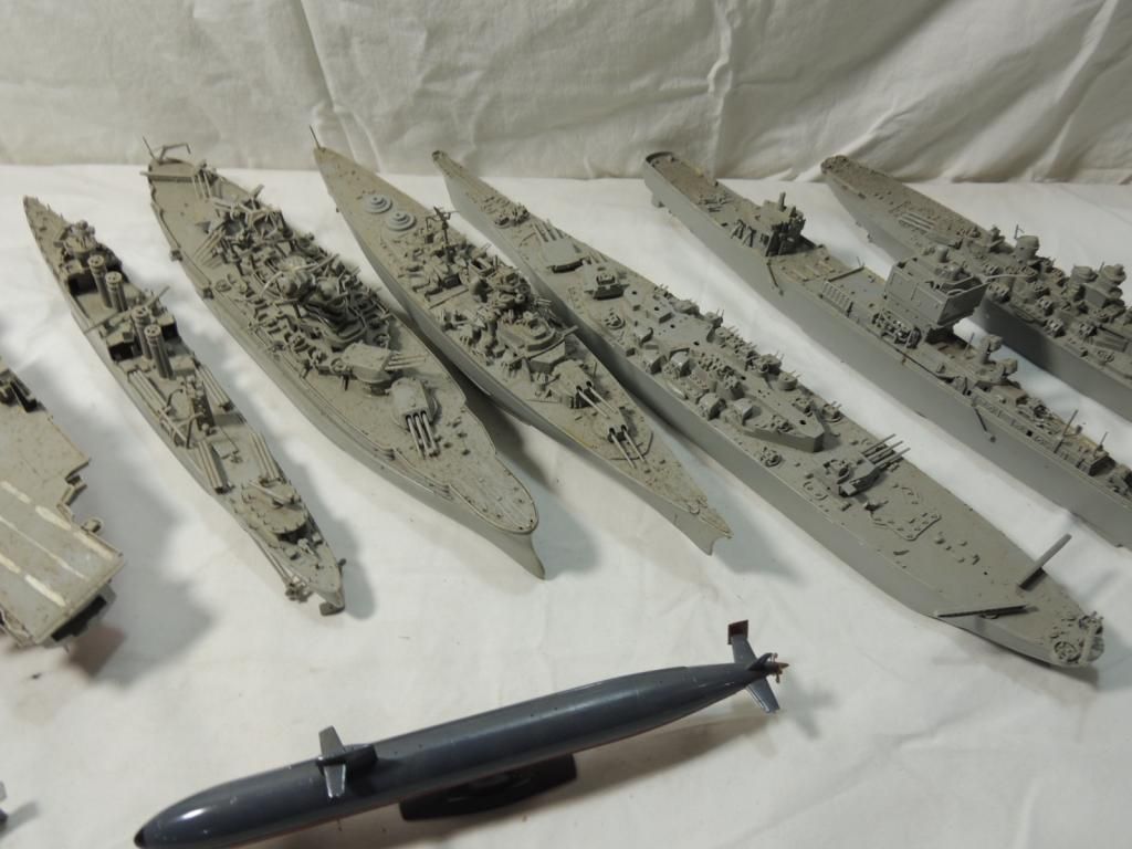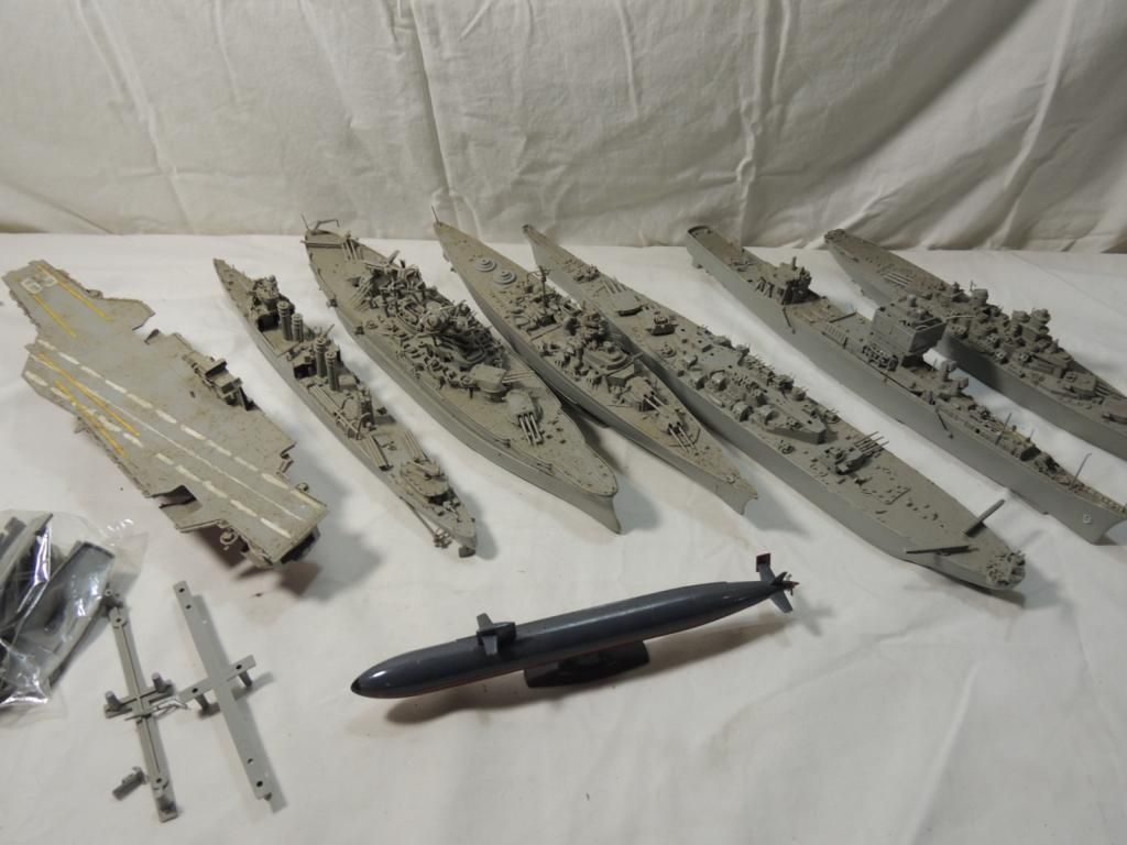 LOT 8 VINTAGE PLASTIC MODEL BATTLESHIP & AIRCRAFT CARRIERS. ASSEMBLED. SOME MISSING PARTS. AS SHOWN. VIEW PICTURE FOR DETAIL