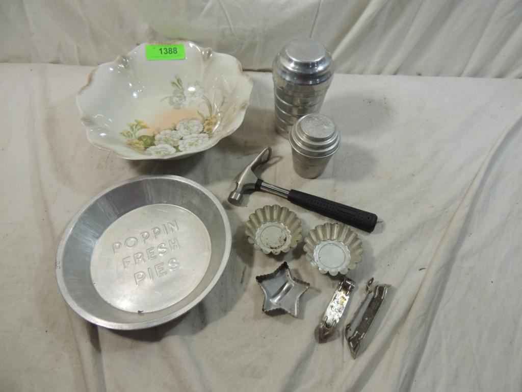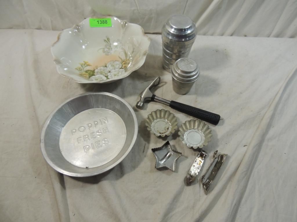 ASSORTED SMOOTHIE SHAKER, TIN SHAKER, COOKIE CUTTERS, PIE TIN, HAMMER, MINI HAMMER, DECORATIVE SERVING BOWL, COLLECTIBLE AS SHOWN SEE PHOTO FOR MORE DETAILS.