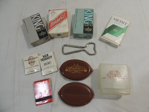 LOT 8 VINTAGE TOBACIANA (4) OLD CIGARETTE PACKS: MERIT, MARVELS, SANO. SMALL CLAM COIN PURSE, BOTTLE OPENER AND MORE. AS SHOWN. VIEW PICTURE FOR DETAIL.
