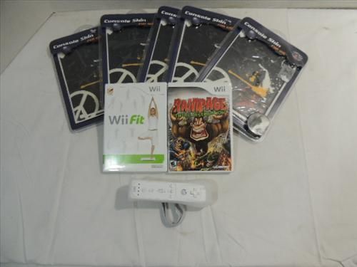 LOT 8 WII ITEMS: 5 WII CONSOLE SKINS, 2 GAMES, 1 CONTROLLER. AS SHOWN. VIEW PICTURE FOR DETAIL.