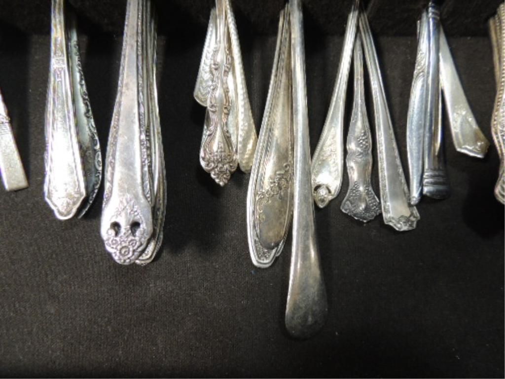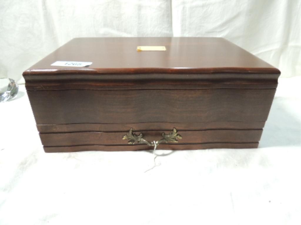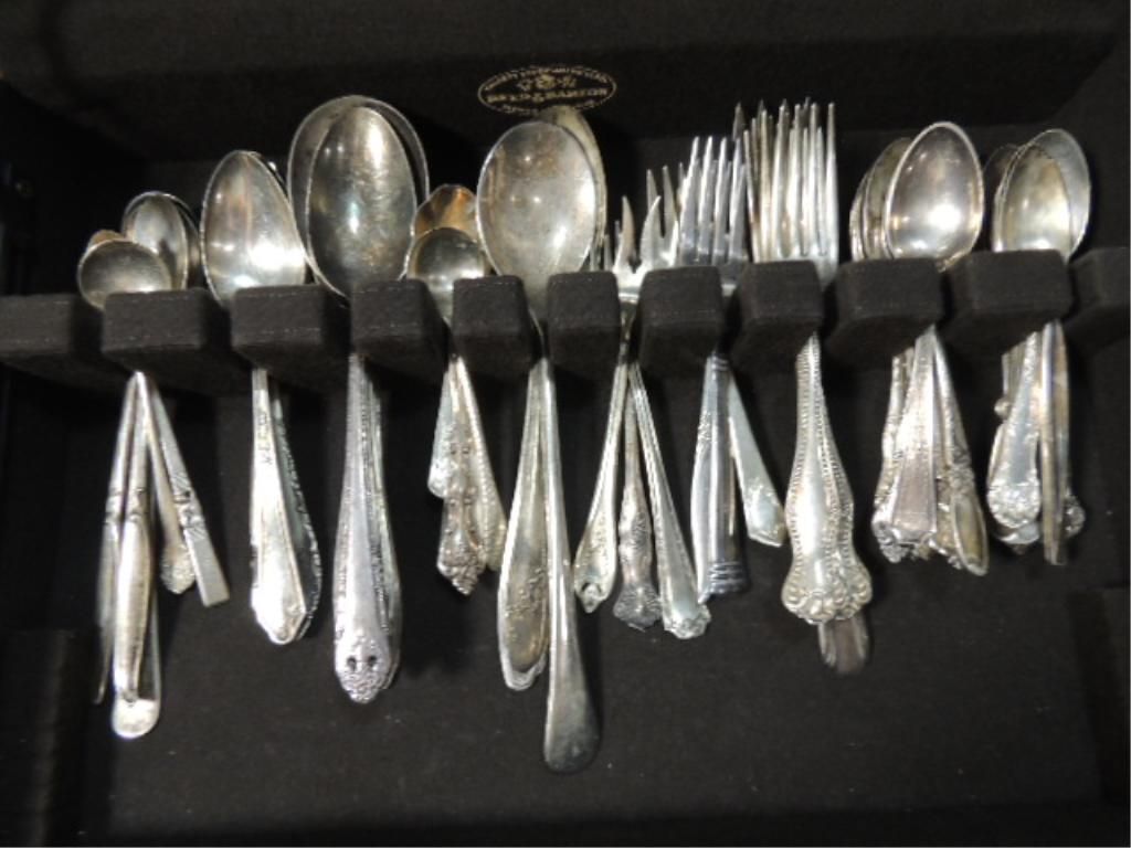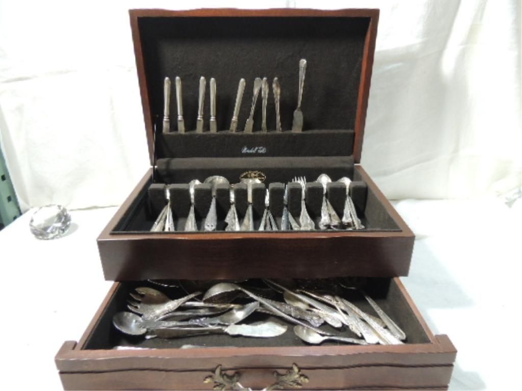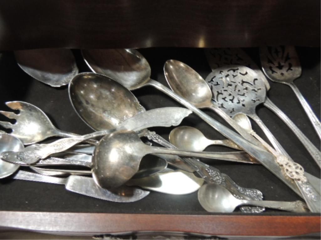 BEAUTIFUL WOOD SILVERWARE CHEST. MIXED SILVERWARE PIECES SPOONS, KNIVES, GRAPEFRUIT SPOONS, FORKS, KNIVES, SERVING UTENCILS. AS SHOWN. SEE PHOTO FOR MORE DETAILS.