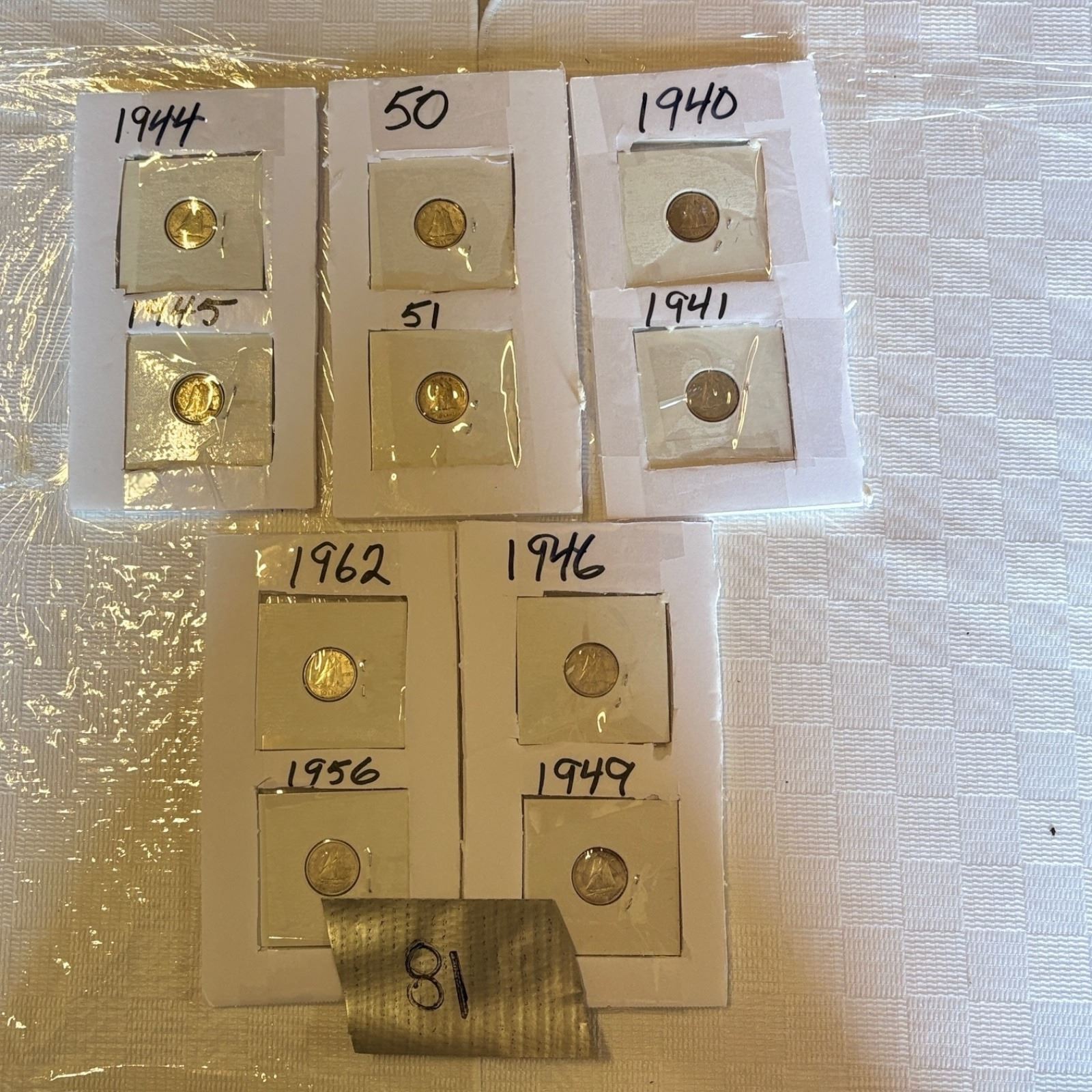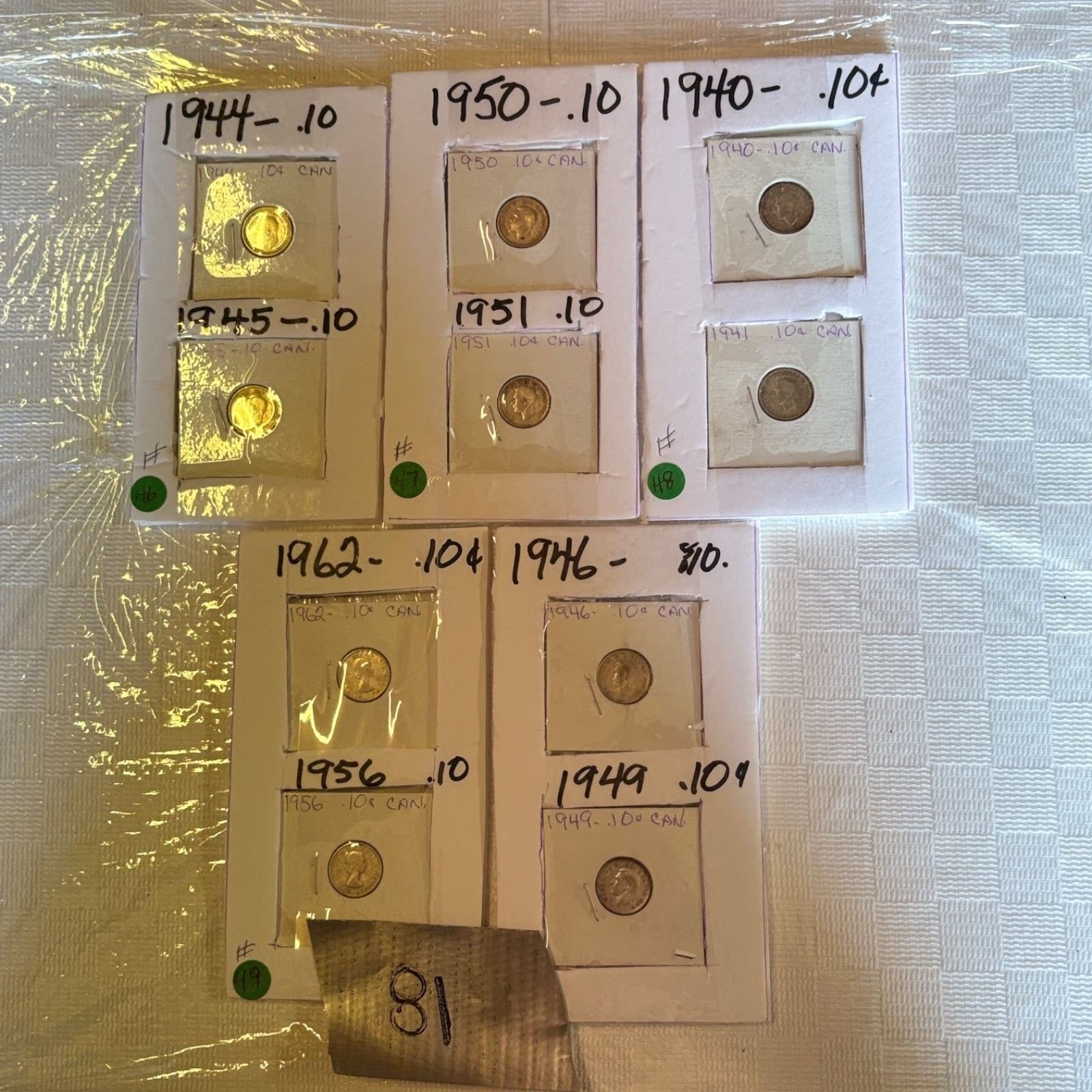 1940-41, 1944-45-46, 1949, 1950-51, 1956, 1962, ten cent coins