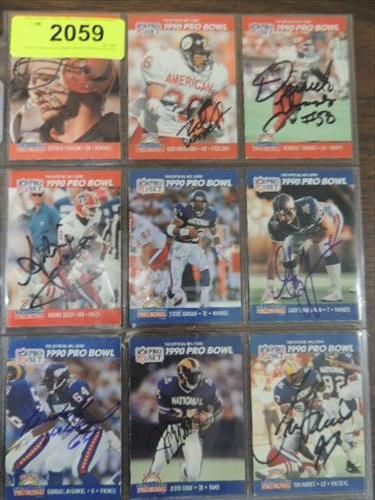 LOT 9 1990 PRO AUTOGRAPH FOOTBALL CARDS: ANDRE REED, BOOMER EIASON, ROD WOODSON, DERRICK THOMAS, STEVE JORDAN, GARY ZIMMERMAN, RANDALL MCDANIAL, JERRY GRAY, TIM HARRIS. NO COA. AS SHOWN. VIEW PICTURE FOR DETAIL. PLEASE BE ADVISED, AND INFORMED REGARDING SIGNATURES OR AUTOGRAPHS THAT WE SELL AT AUCTION: WE ARE NOT AUTHENTICATORS, AND WE DO NOT AUTHENTICATE, OR VALIDATE ANY AUTOGRAPHS OR SIGNATURES THAT WE OFFER AT AUCTION. SOME AUTOGRAPHS OR SIGNATURES MAY COME WITH AN AUTHENTICATION FROM ANY ONE OF LITERALLY HUNDREDS OF AUTHENTICATORS ACROSS THE COUNTRY, AND AROUND THE WORLD. WE DO NOT ENDORSE ANY AUTHENTICATOR, NOR DO WE GUARANTEE THAT ANY AUTOGRAPH OR SIGNATURE IS AUTHENTIC, OR THAT IT WILL PASS AUTHENTICATION BY ANY AUTHENTICATOR. ALL AUTOGRAPHS OR SIGNATURES ARE SOLD