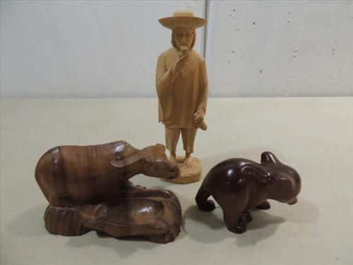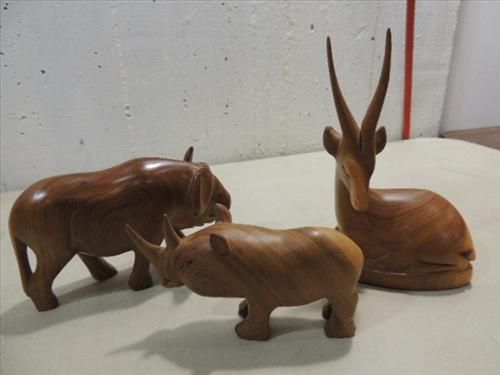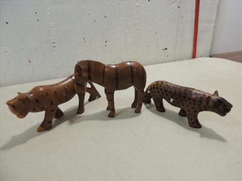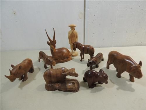 LOT 9 (8) HARDWOOD AFRICAN HAND CARVED ANIMALS & 1 FIGURINE. AS SHOWN. VIEW PICTURE FOR DETAIL.
