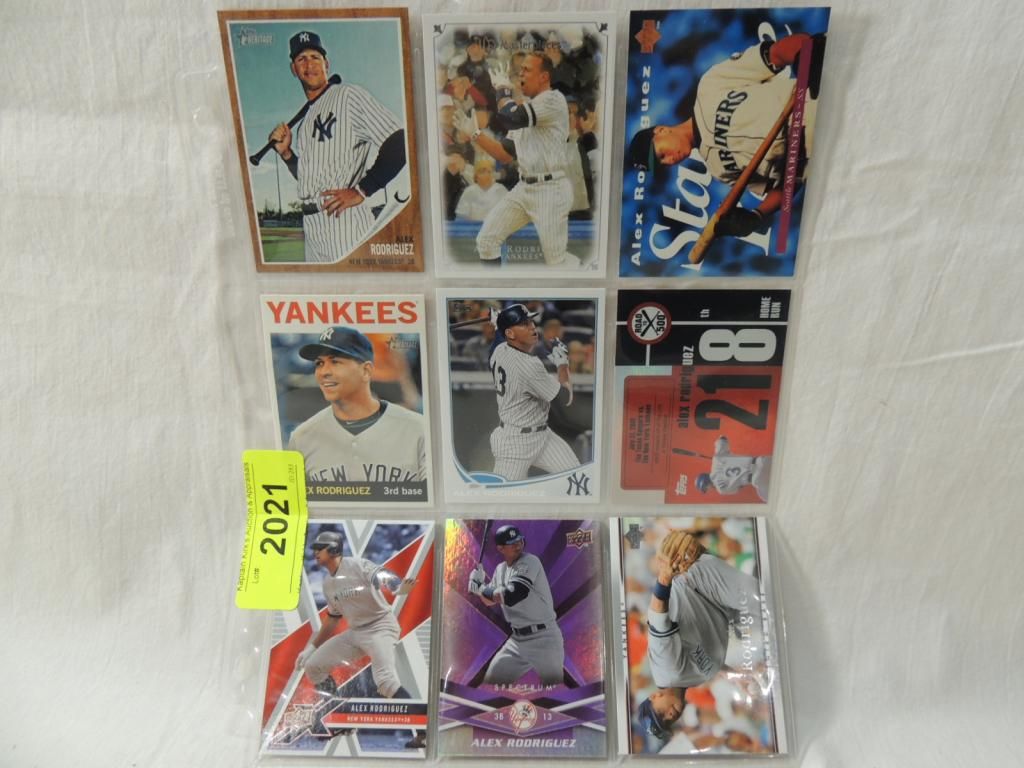 LOT 9 ALEX RODRIGUEZ BASEBALL PLAYER CARDS. MIXED MAKERS AND YEARS. AS SHOWN. SEE PHOTO FOR MORE DETAILS.
