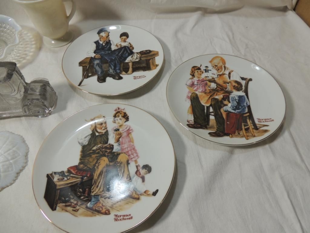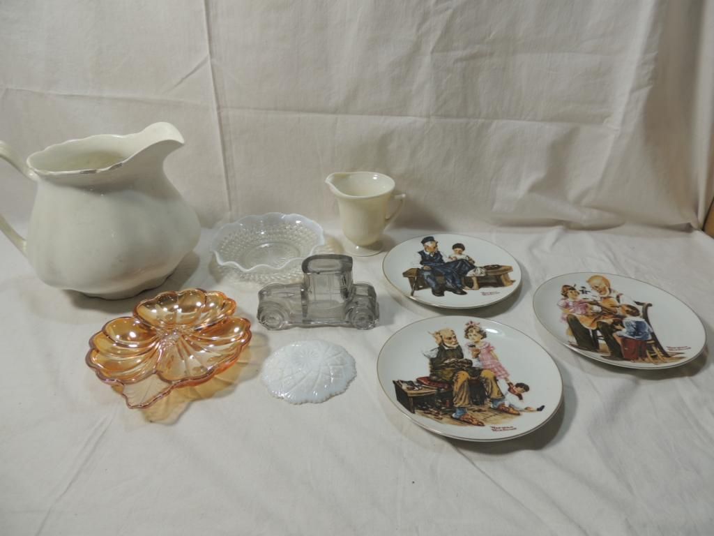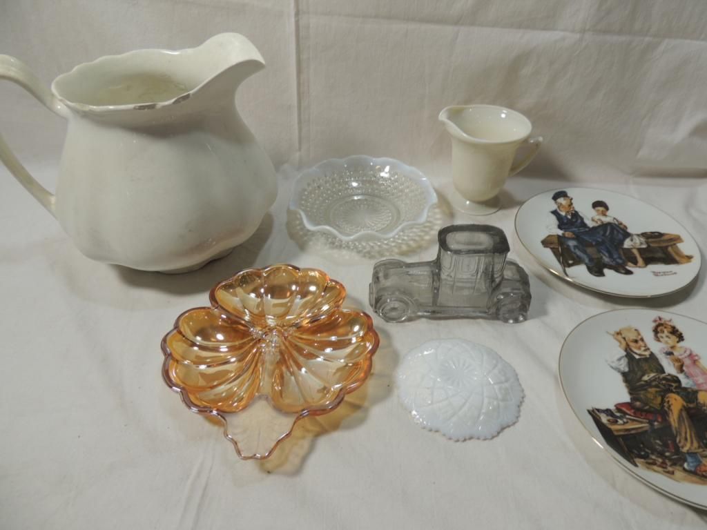 CERAMIC PITCHER. WHITE GLASS PITCHER. CARNIVAL GLASS DISH. MARIGOLD DISH, WHITE GLASS SMALL DISH. GLASS CAR. NORMAN ROCKWELL PLATES. AS SHOWN. SEE PHOTO FOR MORE DETAILS.