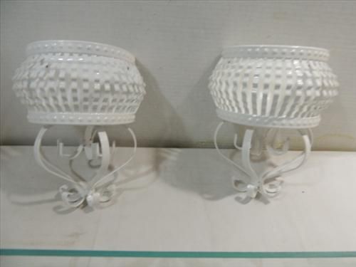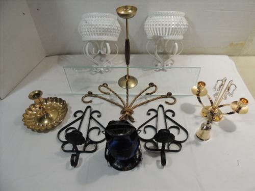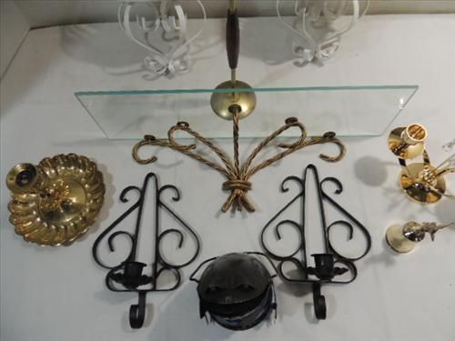 LOT 9 ASSORTED CONTEMPORARY DECORATIVE ITEMS: WALL MOUNT GLASS SHELF, WROUGHT IRON CANDLEHOLDERS, BRASS CANDLE HOLDERS AND WHITE METAL WALL MOUNT ACCENT PIECES FOR PLANTERS. AS SHOWN. VIEW PICTURE FOR DETAIL.