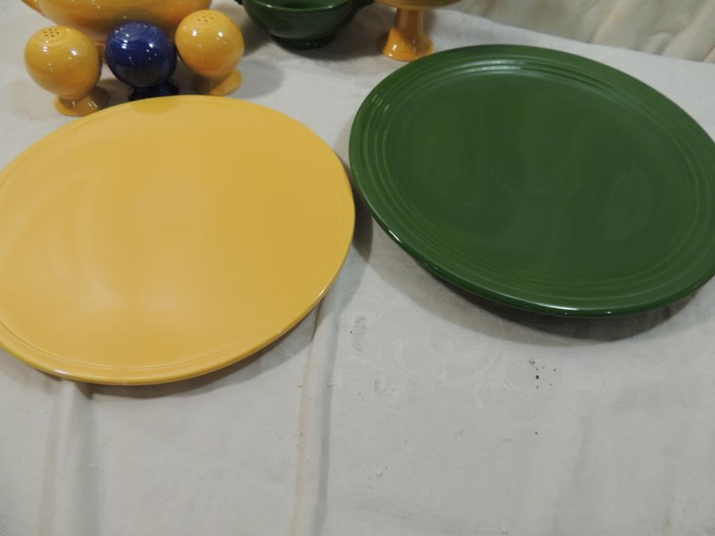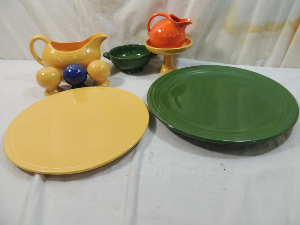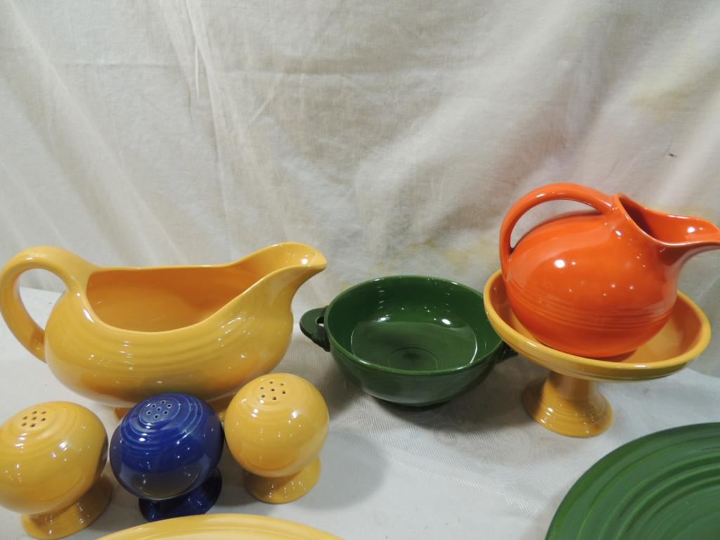 SERVING PLATE, GRAVY BOAT, SALT & PEPPER SHAKER, CREAMER, SMALL BOWL, CANDY DISH, ASSORTED PIECES FIESTA POTTERY DINNERWARE, DISH SETS, COLLECTIBLE, COLORFUL, POTTERY VINTAGE, ORIGINAL FIESTA WARE AS SHOWN SEE PHOTO FOR MORE DETAILS.