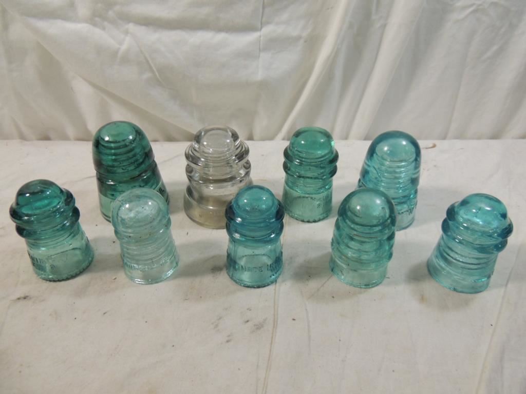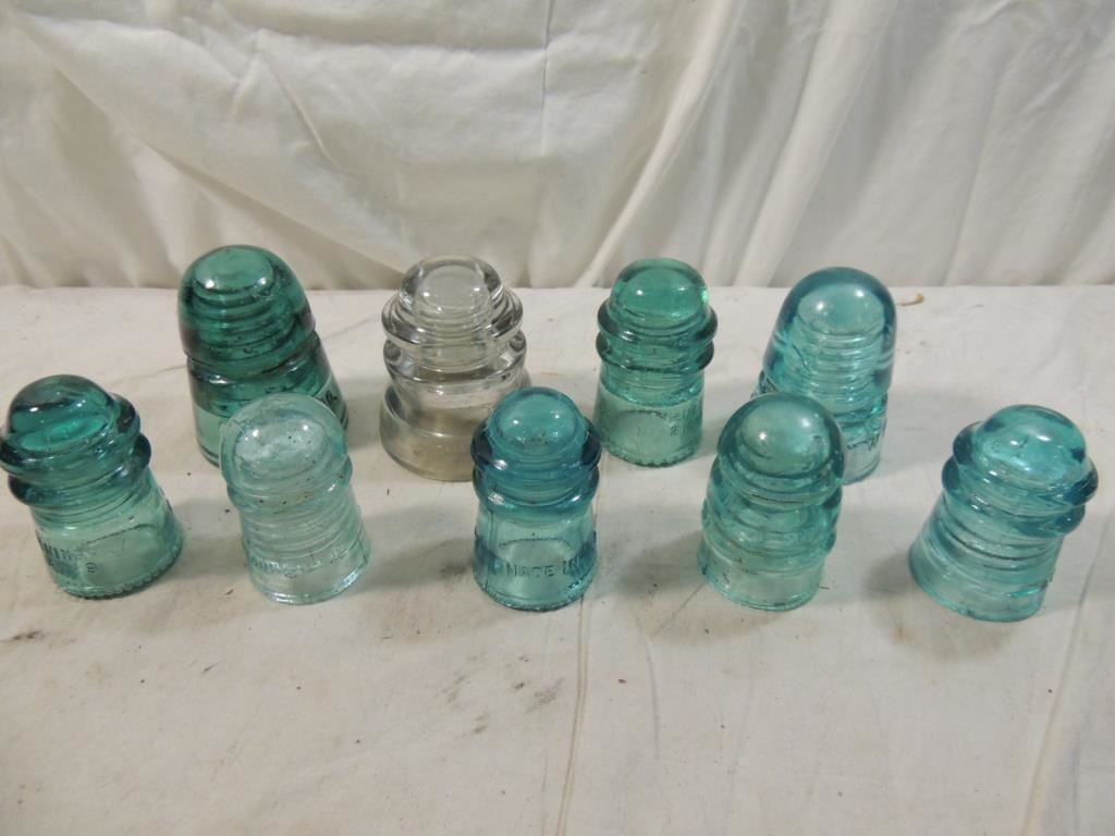 BLUE GLASS & CLEAR GLASS INSULATORS, ASSORTED STYLES, COLLECTIBLE INSULATORS. AS SHOWN SEE PHOTO FOR MORE DETAILS.