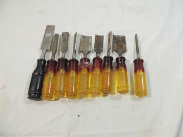 ACE HARDWARE HAND CHISELS, VARIOUS SIZES HAND CHISELS, CARIOUS SIZES AND STYLES, COLLECTIBLE, HAND TOOLS, WOODWORKING TOOLS AS SHOWN SEE PHOTO FOR MORE DETAILS.