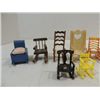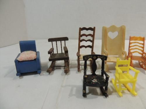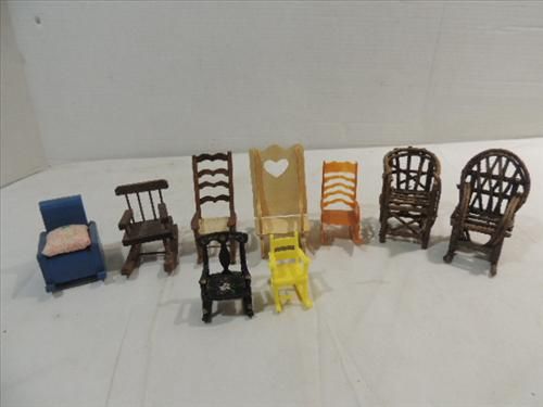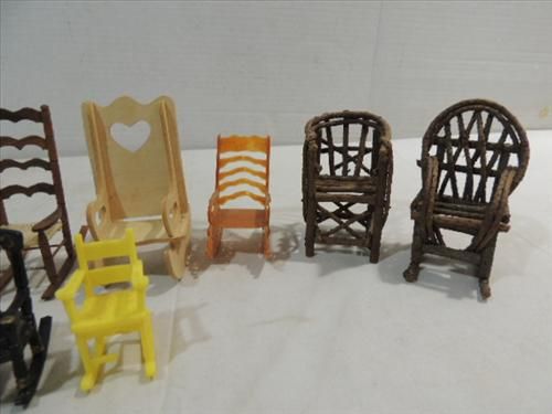 LOT 9 ASSORTED MINIATURE DOLL ROCKING CHAIRS. AS SHOWN. VIEW PICTURE FOR DETAIL.