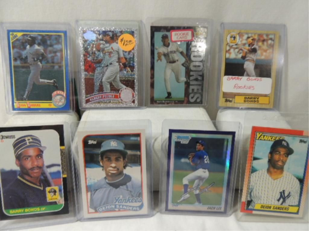 1994 UPPER DECK #24 BASEBALL ROOKIE CARD ALEX RODRIGUEZ. 2 BARRY BONDS 1987 TOPPS & DONRUSS BASEBALL ROOKIE CARDS4 1990 ALL DEION SANDERS (3) BASEBALL, 1 FOOTBALL CARD2010 TOPPS #87 REFRACTOR BASEBALL ROOKIE CARD ZACH LEE. TOPPS#547 ALBERT PUJOLS PLAYER CARD ANNIVERSARY EDITION. AS SHOWN, SEE PICTURES FOR DETAILS.