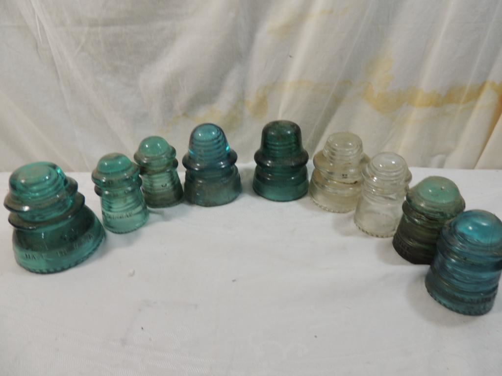 VINTAGE GLASS INSULATORS, ELECTRICAL INSULATORS, GREEN GLASS, BLUE GLASS, CLEAR GLASS INSULATORS, AS SHOWN SEE PHOTO FOR MORE DETAILS.