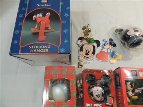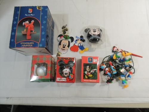 LOT 9 MICKEY MOUSE CHRISTMAS DECORATIONS: ORNAMENTS, STRING OF LIGHTS, STOCKING HANGER. AS SHOWN. VIEW PICTURE FOR DETAIL.