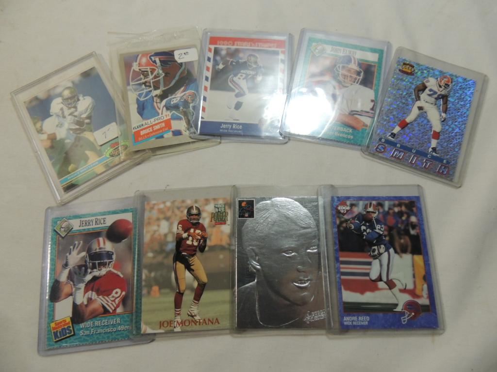 BRUCE SMITH, ANDRE REED, JIM KELLY, JOE MONTANA, JERRY RICE, JOHN ELWAY, JERRY RICE, BRUCE SMITH, RICKY WATTERS FOOTBALL PLAYER CARDS. TRADING CARDS. COLLECTIBLE. FOOTBALL MEMORABILIA. GOOD CONDITION AS SHOWN. SEE PHOTO FOR MORE DETAILS.