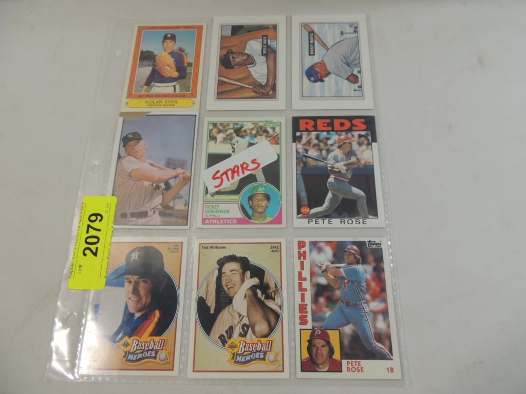 NOLAN RYAN, WILLIE MAYS, MICKEY MANTLE, RICKEY HENDERSON, PETE ROSE, TED WILLIAMS, BASEBALL PLAYER CARDS. BASEBALL TRADING CARDS. COLLECTIBLE. PROTECTIVE PLASTIC BINDER SHEET. SPORTS MEMORABILIA.. GOOD CONDITION. AS SHOWN SEE PHOTO FOR MORE DETAILS.