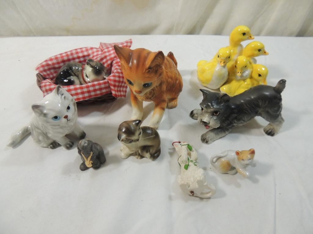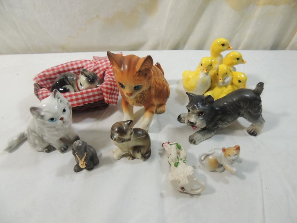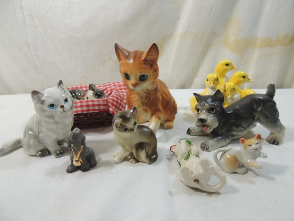 LEFTON PIECES, DOG, DUCKS, KITTENS, CATS, VINTAGE CERAMIC AND PORCELAIN FIGURINES, DECORATIVE, COLLECTIBLE, DESIGNER, AS SHOWN SEE PHOTO FOR MORE DETAILS.