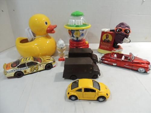LOT 9 MISCELLANEOUS TOYS: 3 DIE CAST METAL CARS, 1 SUN MAID RAISIN COIN BANK, M&M'S DISPENSER AND A CERAMIC DUCKIE. AS SHOWN. VIEW PICTURE FOR DETAIL.