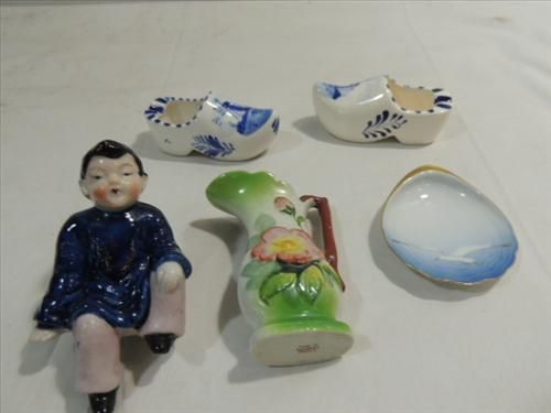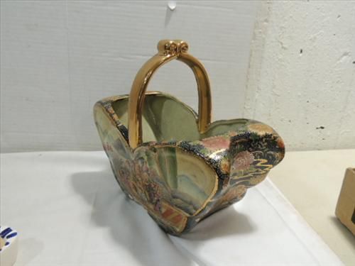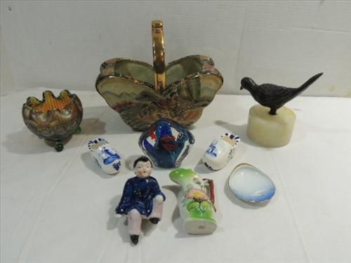 LOT 9 MIXED CERAMIC & GLASS: NORTHWWOD CARNIVAL ROSE BOWL, 2 DELFT DUTCH SHOES, GLASS PAPER WEIGHT, ORIENTAL CERAMIC ORNATE BASKET, AND MORE. AS SHOWN. VIEW PICTURE FOR DETAIL.