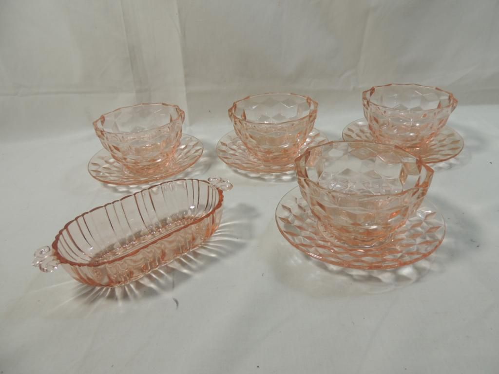 PINK DEPRESSION GLASS SMALL BOWLS, SMALL PLATES, BUTTER DISH. AS SHOWN. SEE PHOTO FOR MORE DETAILS.
