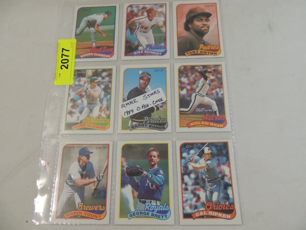 O PEE CHEE ROGER CLEMENS, MIKE SCHMIDT, TONY GWYNN, MARK MCGWIRE, BARRY BONDS, NOLAN RYAN, ROBIN YOUNT, GEORGE BRETT, CAL RIPKEN BASEBALL PLAYER CARDS. BASEBALL TRADING CARDS. COLLECTIBLE. PROTECTIVE PLASTIC BINDER SHEET. SPORTS MEMORABILIA.. GOOD CONDITION. AS SHOWN SEE PHOTO FOR MORE DETAILS.