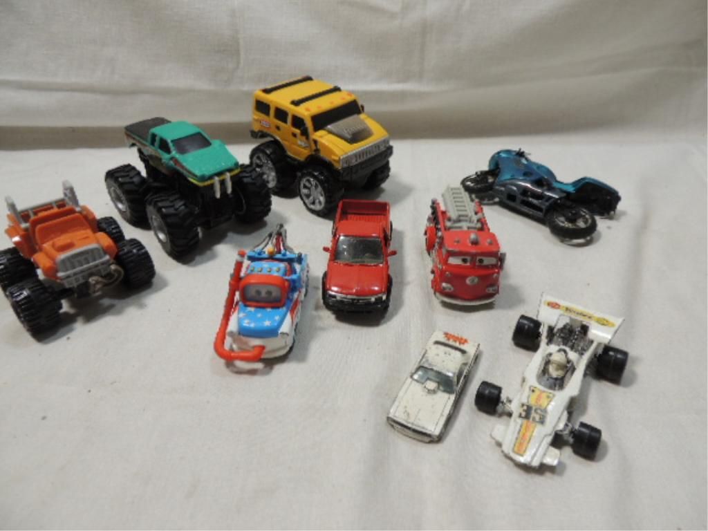 LOT 9 TOY CARS, TRUCKS, MOTORCYCLE, HUMMER, TOW TRUCK, MONSTER TRUCK