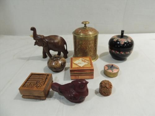 LOT 9 VARIOUS SMALL METAL & WOOD KEEPS WITH LIDS, ELEPHANT, BIRD. AS SHOWN. VIEW PICTURE FOR DETAIL.