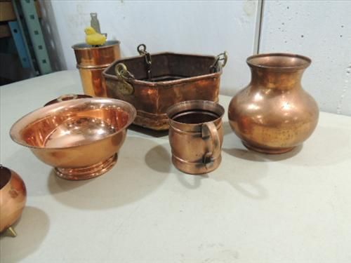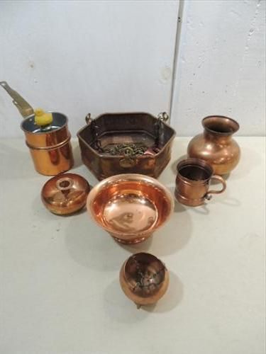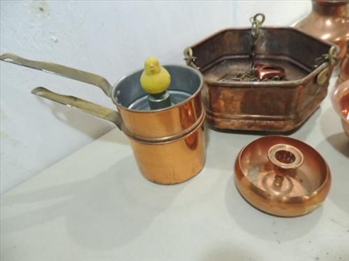 LOT 9 VINTAGE ASSORTED COPPERWARE: DOUBLE STEAMER EGG COOKING PANS WITH BIRD WHISTLE, LARGE PLANTER, BOWL, MUG AND MORE. AS SHOWN. VIEW PICTURE FOR DETAIL.
