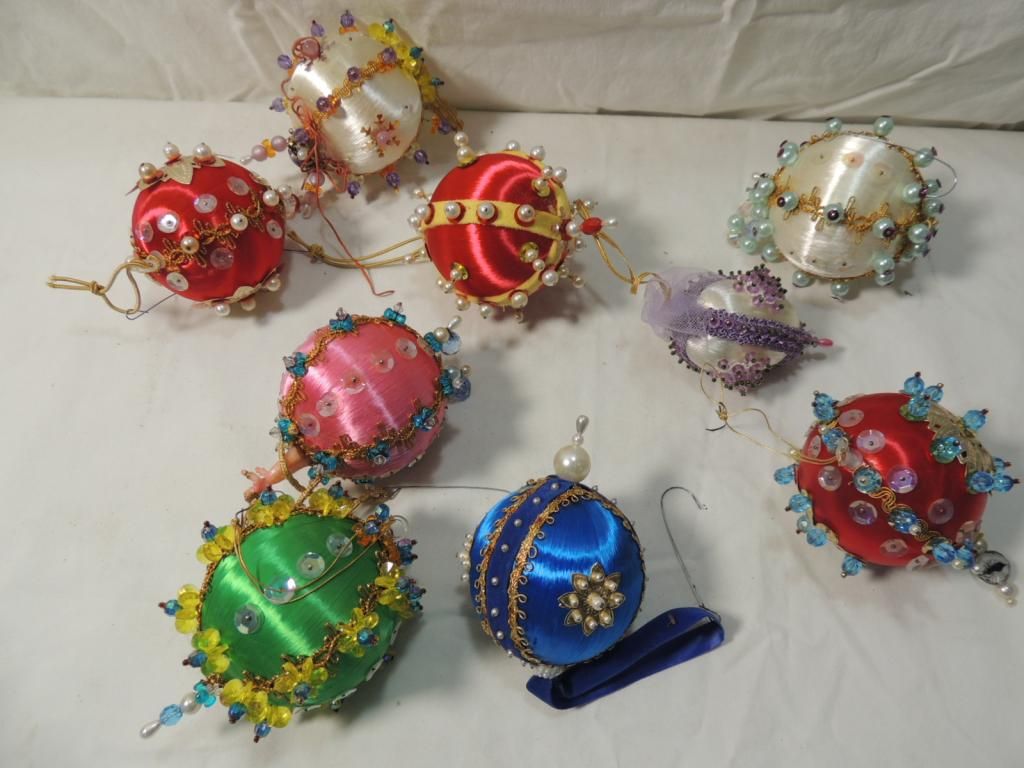 9 VINTAGE BEADED ORNAMENTS. UNIQUE HAND MADE BEADED ORNAMENTS. AS SHOWN. SEE PHOTO FOR MORE DETAILS.