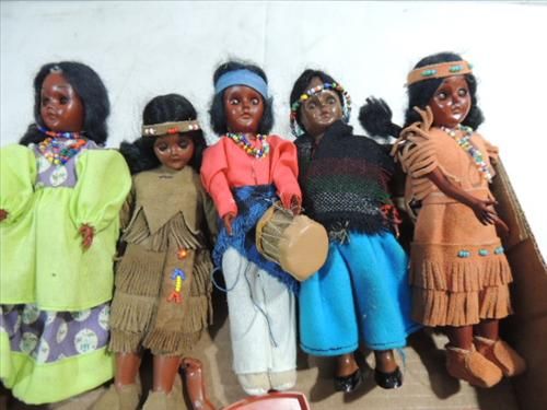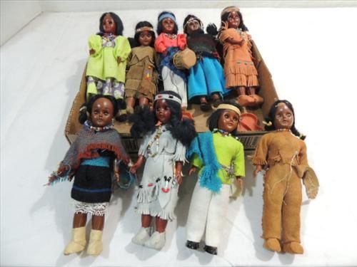 LOT 9 VINTAGE CARLSON DOLLS NATIVE AMERICAN GIRLS. 7"H. AS SHOWN. VIEW PICTURE FOR DETAIL.
