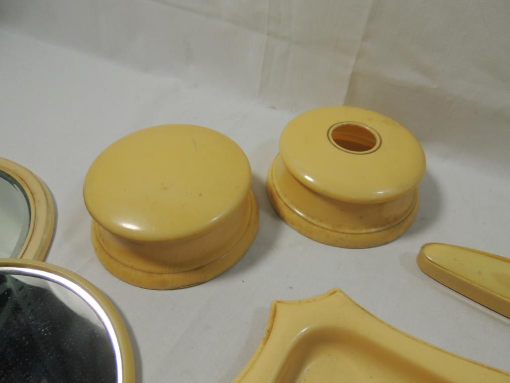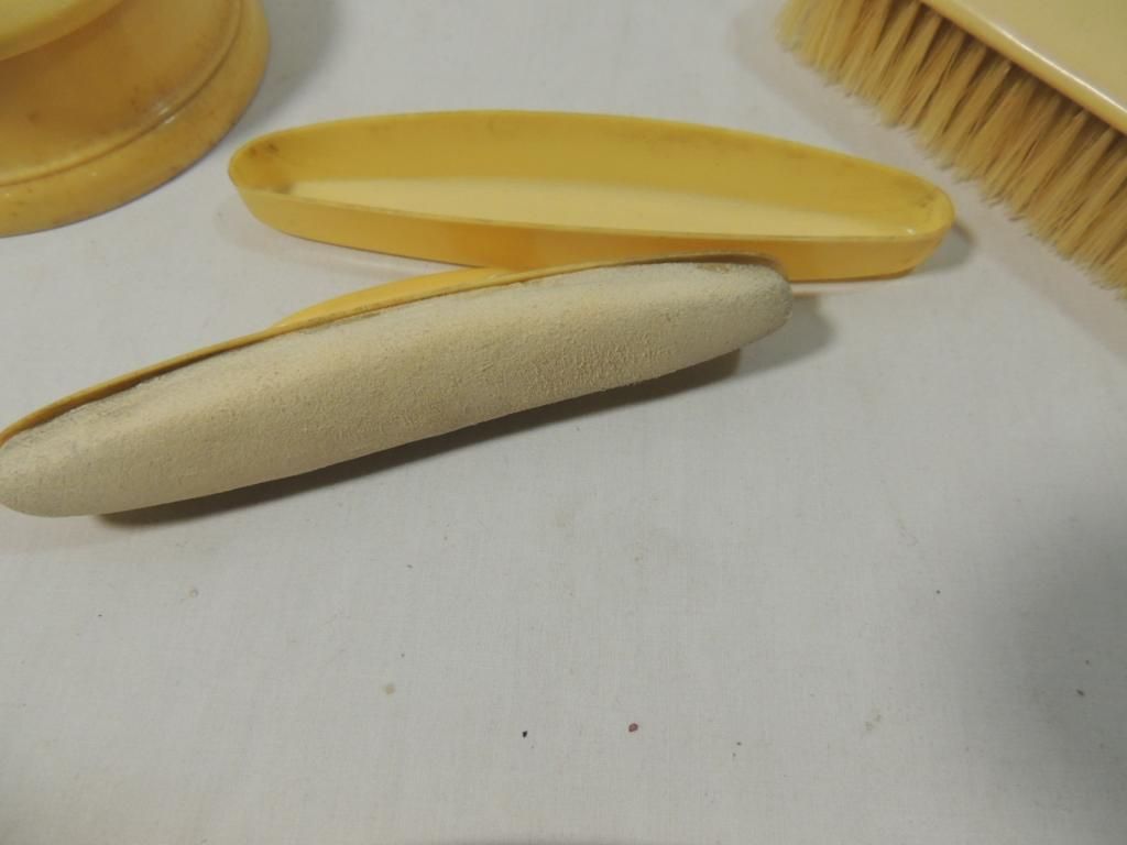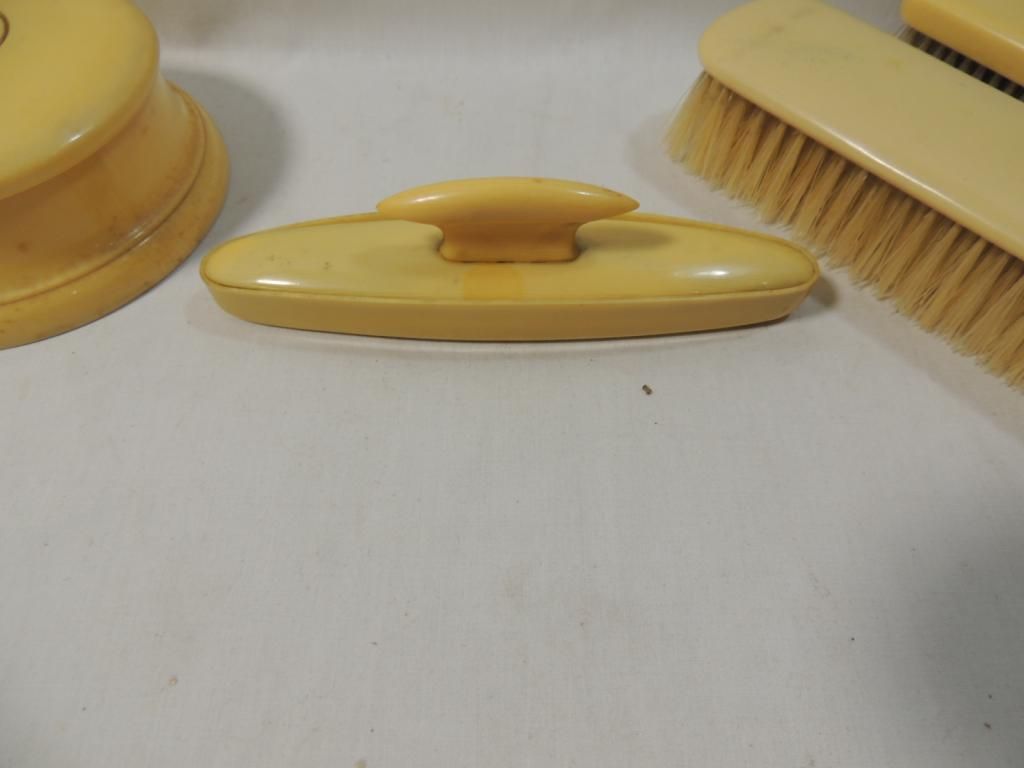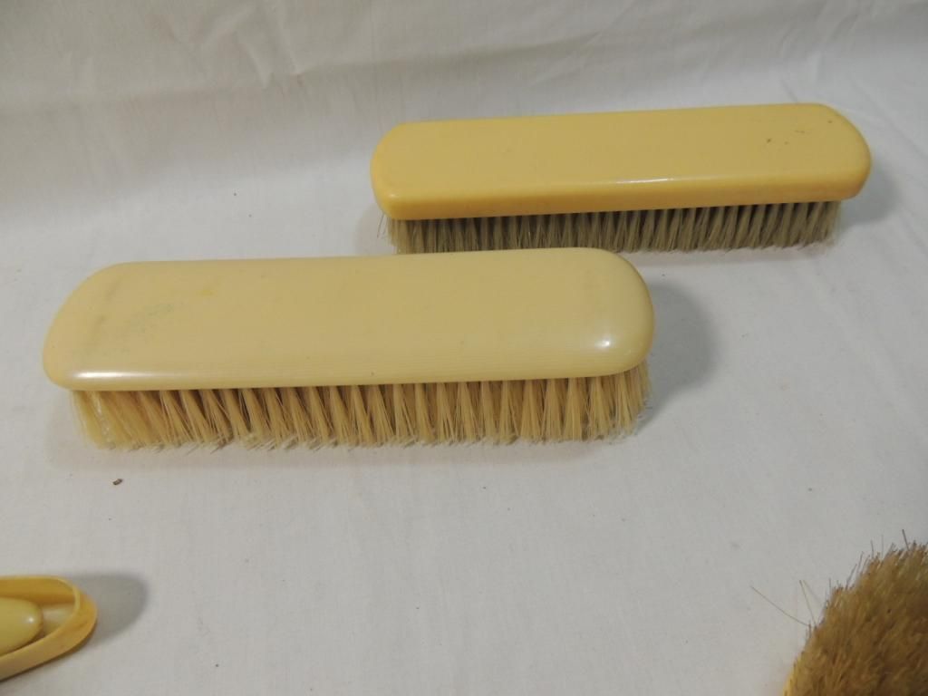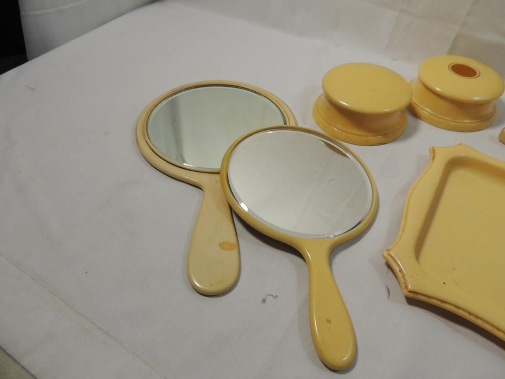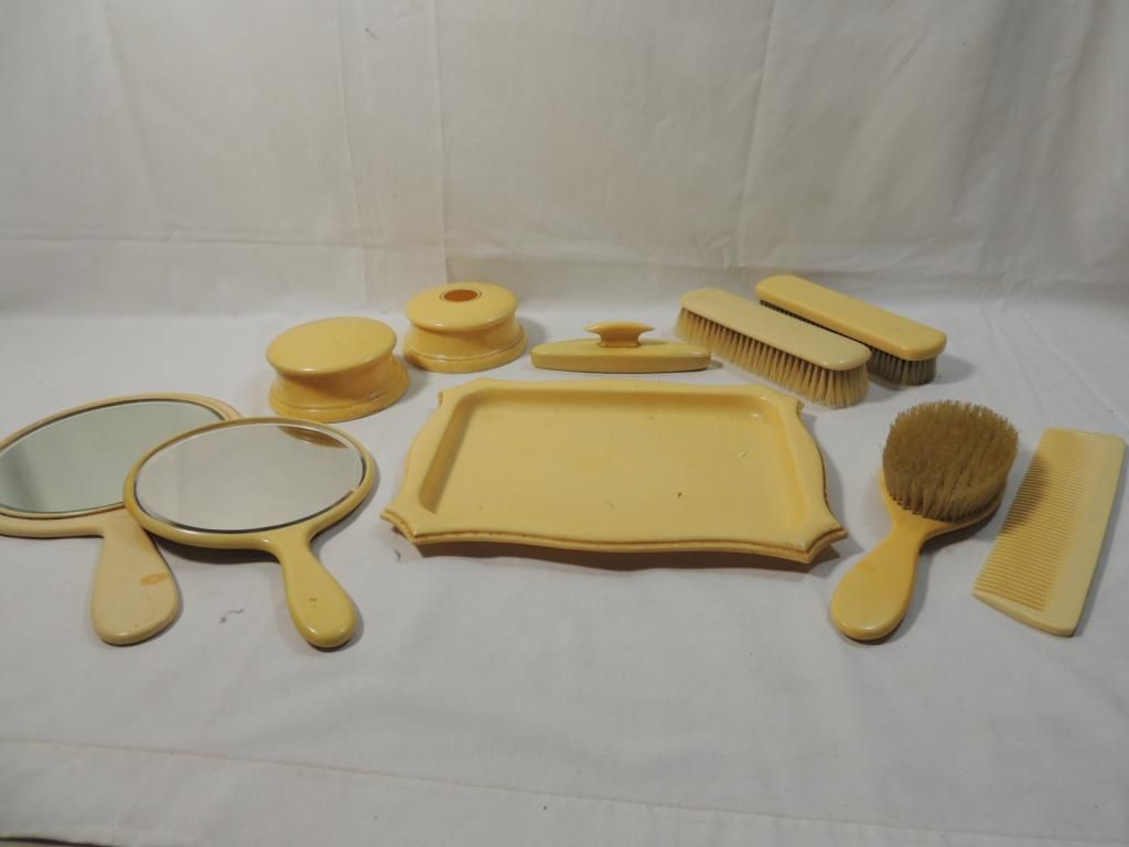 BRUSHES, COMB, TRAY, NAIL BUFFER CANISTERS MIRROR. AS SHOWN. SEE PHOTO FOR MORE DETAILS.