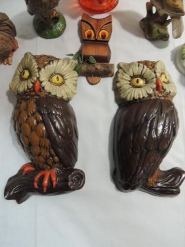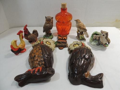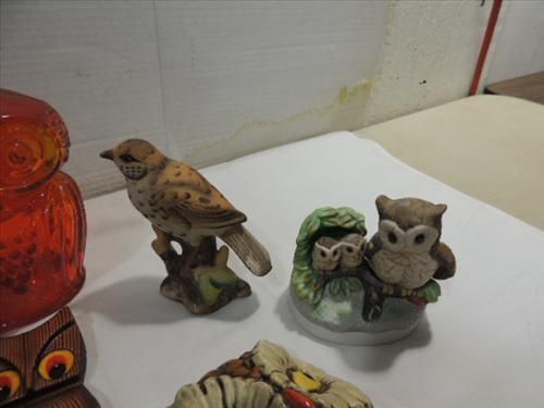 LOT 9 VINTAGE CERAMIC, PORCELAIN & GLASS OWLS AND BIRDS. AS SHOWN. VIEW PICTURE FOR DETAIL.