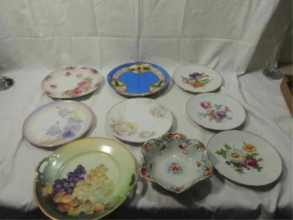 LOT 9 VINTAGE CHINA PLATES: PRUSSIAN, BAVARIAN, JAPAN 8 FLORAL PLATES. RUFFLED BOWL. AS SHOWN. VIEW PICTURE FOR DETAIL.