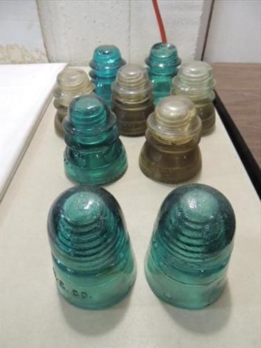LOT 9 VINTAGE GLASS ELECTRICAL INSULATORS: 7 HEMINGRAY, 2 H.G. CO. AS SHOWN. VIEW PICTURE FOR DETAIL.