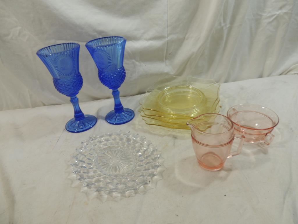 PINK DEPRESSION GLASS, IMPREIAL VIKING GLASS, AVON GEORGE WASHINGTON GOBLET, CUBE PLATE, AS SHOWN SEE PHOTO FOR MORE DETAILS.