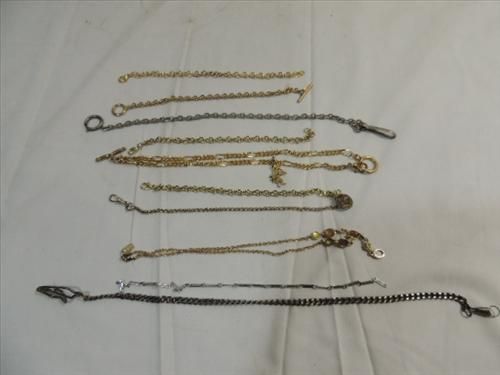 LOT 9 VINTAGE & NEW POCKET WATCH CHAINS GOLD TONE. AS SHOWN. VIEW PICTURE FOR DETAIL.