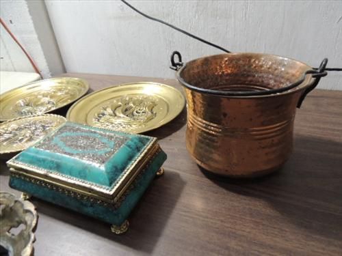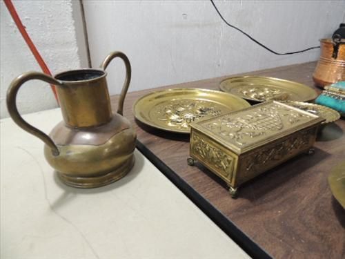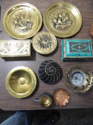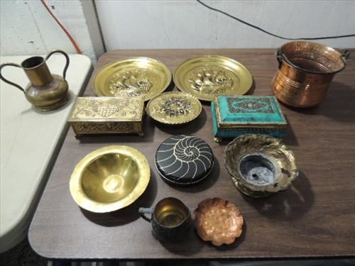 LOT 9 VINTAGE PRESS METAL, 3 BRASS WALL DECORATIVE PLATES, 2 JEWELRY BOXES, TIN, VASE, BOWL, 1 COPPER POT AND MORE. AS SHOWN. VIEW PICTURE FOR DETAIL.