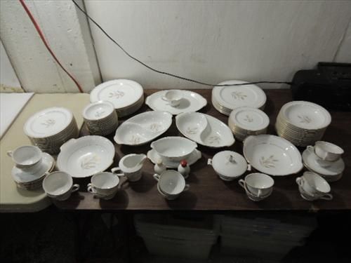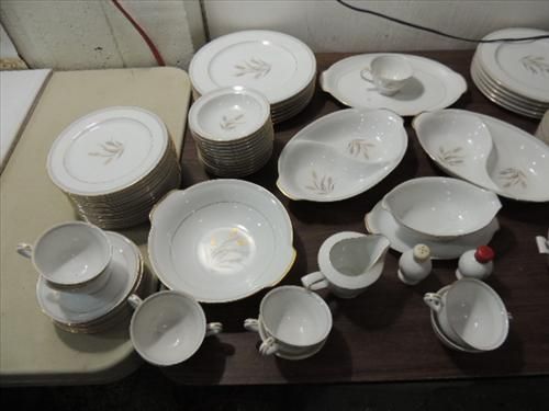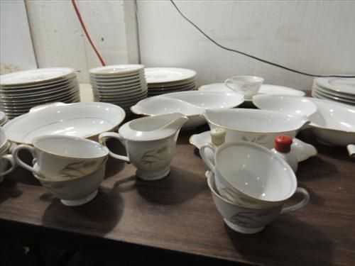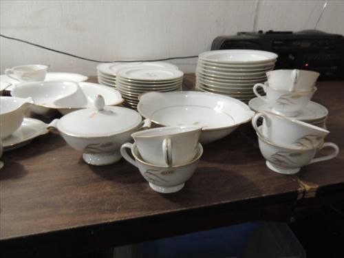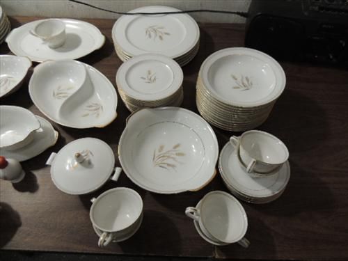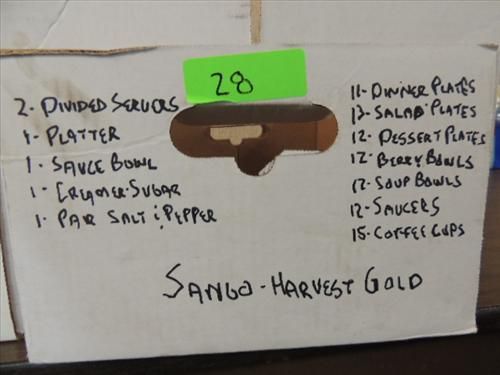 LOT 93 SANGO FINE CHINA, HARVEST GOLD: 11 DINNER PLATES 13 SALAD PLATES, 12 DESERT PLATES, 12 BERRY BOWLS, 12 SOUP BOWLS, 12 SAUCERS, 15 COFFEE CUPS, 2 DIVIDED SERVERS, 1 PLATTER, 1 SAUCE BOWL, 1 CREAMER & SUGAR BOWL & 1 PAIR OF SALT & PEPPER. AS SHOWN. VIEW PICTURE FOR DETAIL.