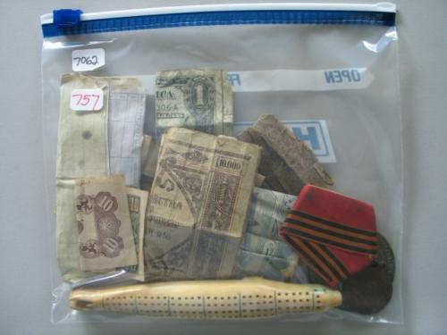 LOT, ASSORT PAPER MONEY, CARVED WHALES TOOTH, MEDAL & MEDALLION