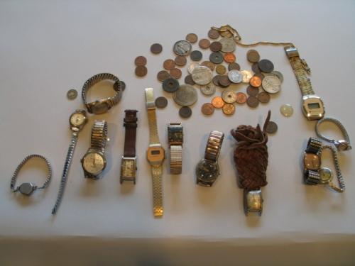 LOT, ASSORT WATCHES & COINS