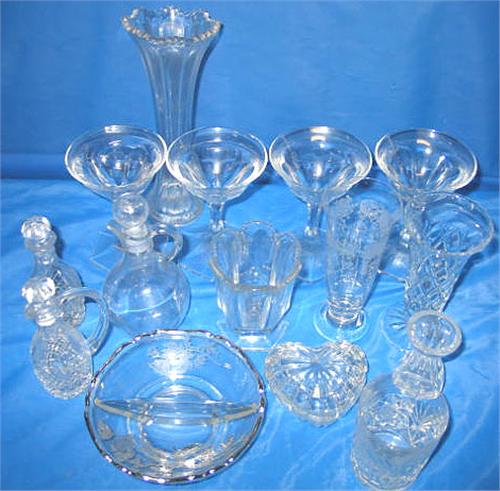 LOT, ASSORTED STEMWARE, VASES, DISHES, CRUETS & CUPS (15 PC)