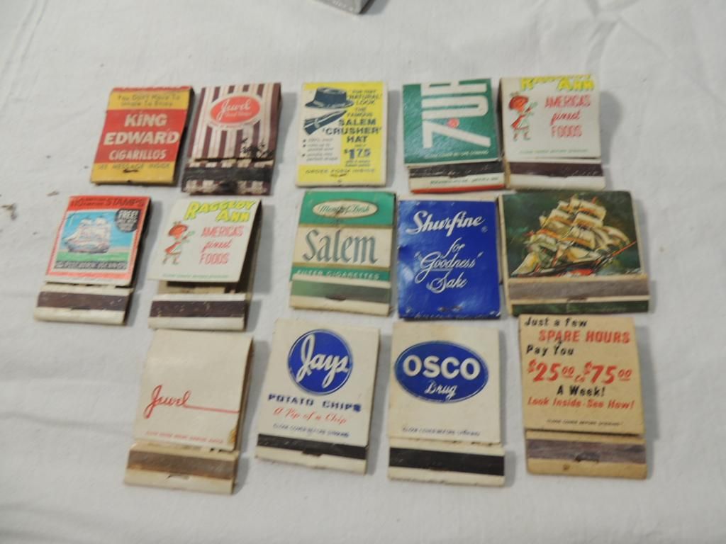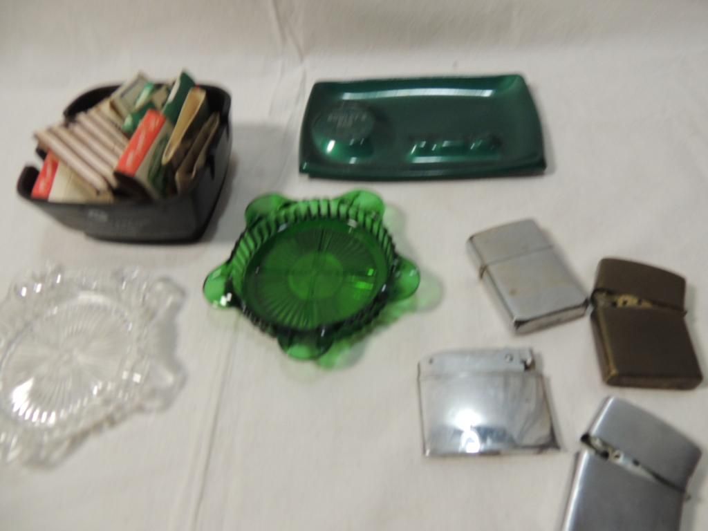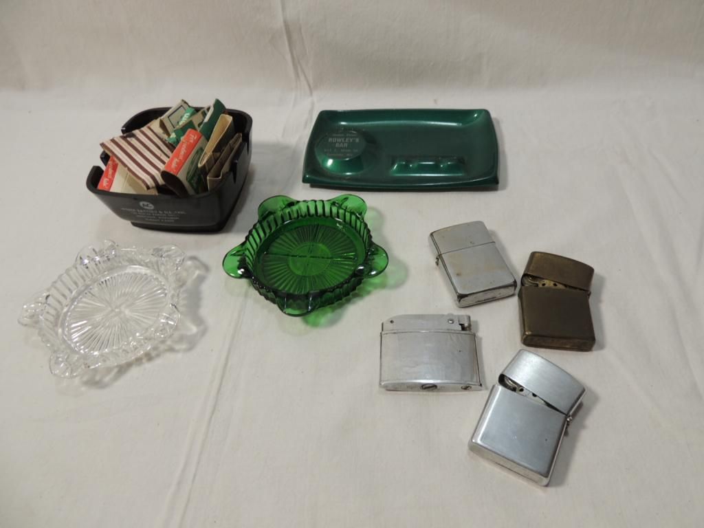 VINTAGE ASH TRAYS, ASSORTED VINTAGE MATCHES. PROMOTIONAL MATCHES. VINTAGE LIGHTERS. ZIPPO STYLE. AS SHOWN. SEE PHOTOS FOR MORE DETAILS.