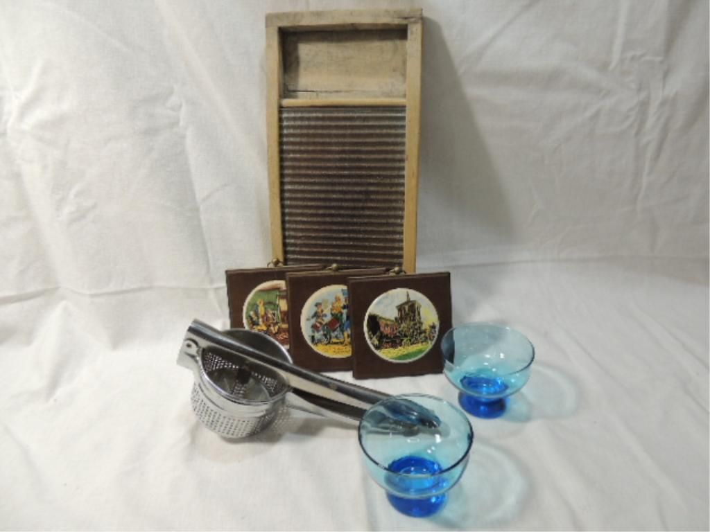 2 PIECES VINTAGE BLUE CLASS WARE, 3 AMERICAN HISTORY PLAQUES, SMALL DECORTIVE ANTIQUE WASH BOARD, VINTAGE FOOD PRESS. SEE PICTURE FOR DETAILS.