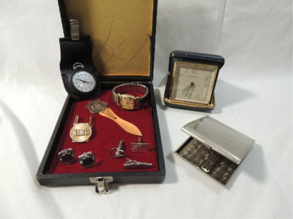 TRAVEL CLOCK, METAL BILLFOLD, LETTER OPENER, WATCH, CUFF LINKS. AS SHOWN. SEE PHOTO FOR MORE DETAILS.