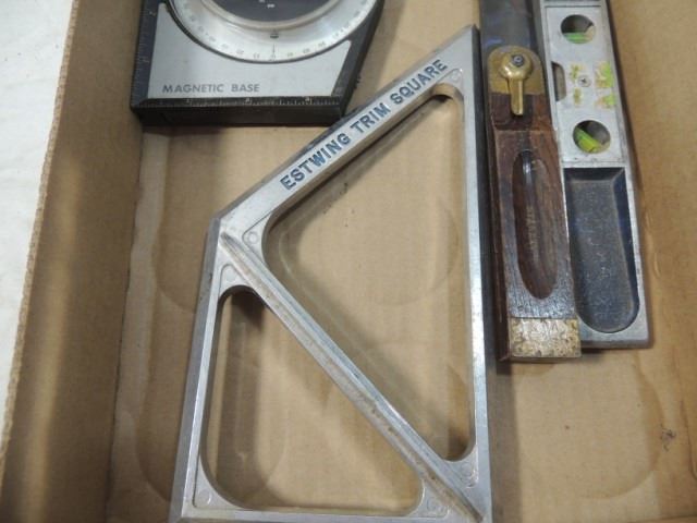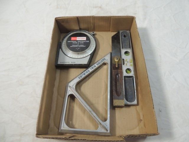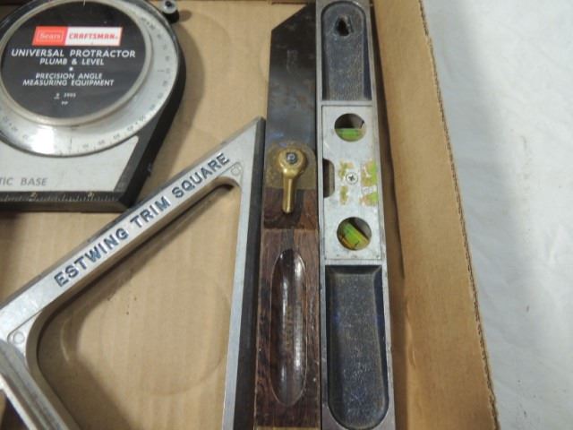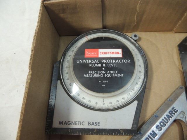 SEARS CRAFTSMAN PROTRACTOR, STANLEY WOOD CARPENTERS SQUARE, STANLEY TORPEDO LEVEL, AND ESTWING ALUMINUM TRIM SQUARE. VINTAGE TOOLS!