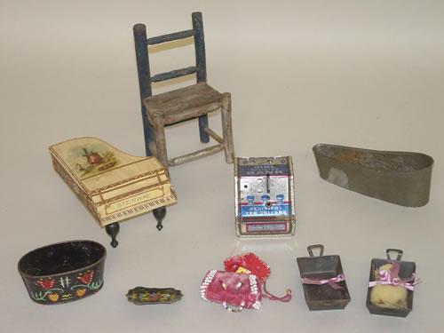 LOT DOLL ACCESSORIES & MINIATURES TO INCLUDE TIN, STEINWAY PIANO, ETC.