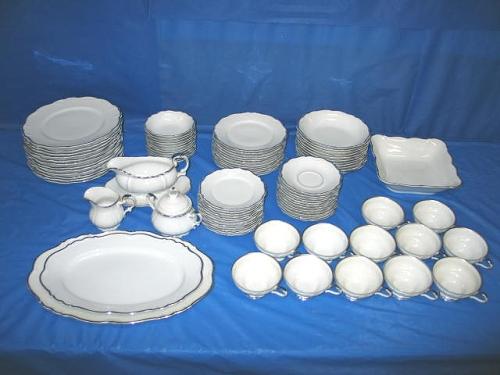 LOT, EDELSTEIN "MARIA-THERESA" CHINA TO INCLUDE: (12)10-1/2" PLATES, (12)8" PLATES, (12) 6-1/2" DESSERT PLATES, (11) 8" BOWLS, (12)5-1/4" BOWLS, (12)6" SAUCERS, (12) CUPS, 9"X 9" SQUARE SERVING DISH, 15-1/4" SERVING DISH, 13-1/2" SERVING DISH, GRAVY BOAT W/ SAUCER, SUGAR BOWL, CREAMER (MADE IN BAVARIA, GERMANY)