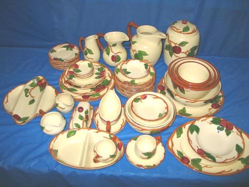 LOT, FRANCISCAN HAND DECORATED DISHES TO INCLUDE: (18)7-1/4" PLATES, (22)SAUCERS, (24) COFFEE CUPS, (6)9-1/2" PLATES, (24)10-1/2" PLATES, 4" SMALL BOWLS, 7-1/2" BOWLS, (6)5-1/2" BOWLS, (16)8-1/2" BOWLS, JAR, GRAVY BOAT, BUTTER DISH, (2) SYRUP DECANTERS, PITCHER & SERVING PLATTER (MADE IN CALIFORNIA)
